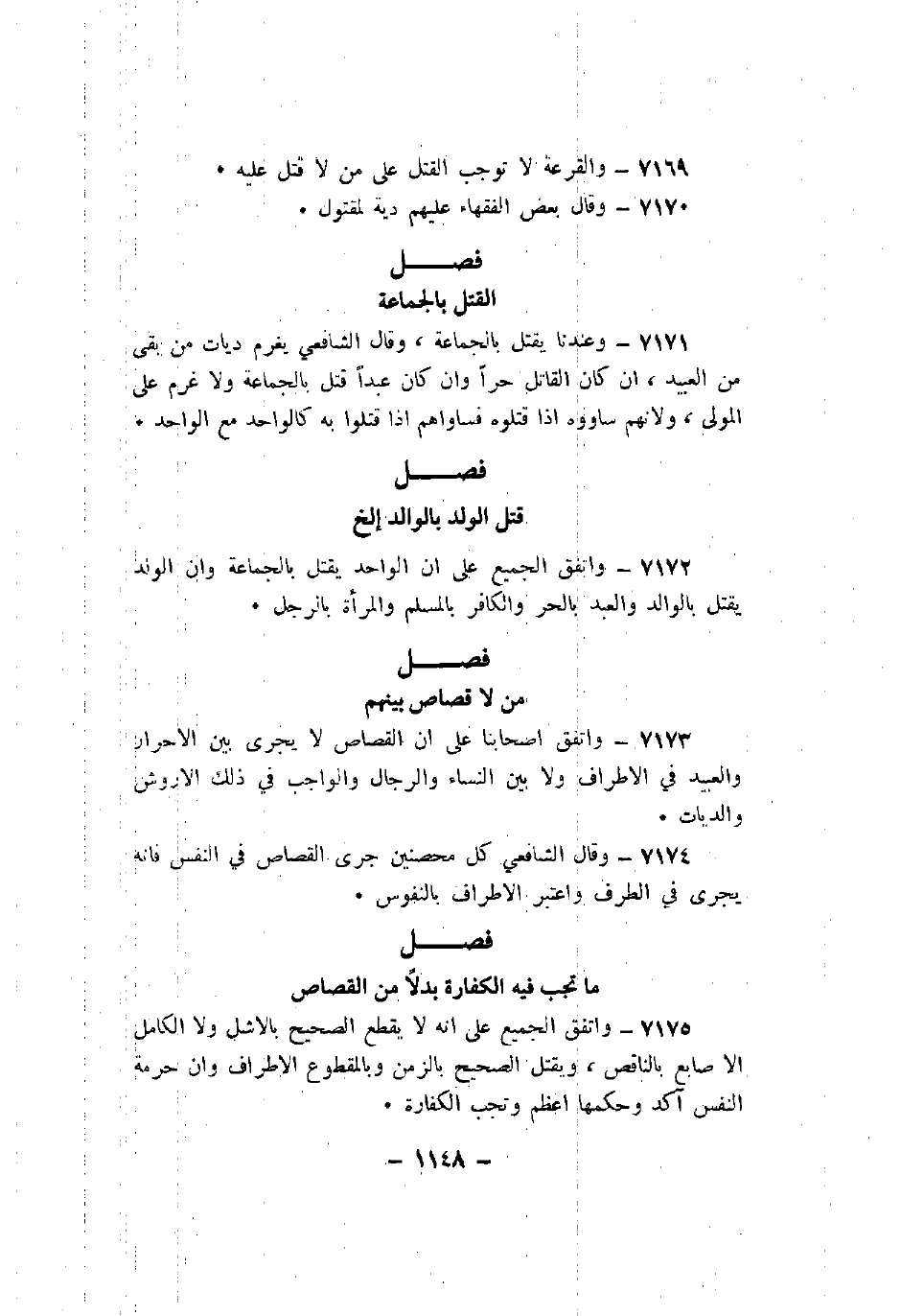 7172 - واتفق الجميع على أن الواحد يقتل بالجماعة وأن الولد يقتل بالوالد والعبد بالحر والكافر بالمسلم والمرأة بالرجل.