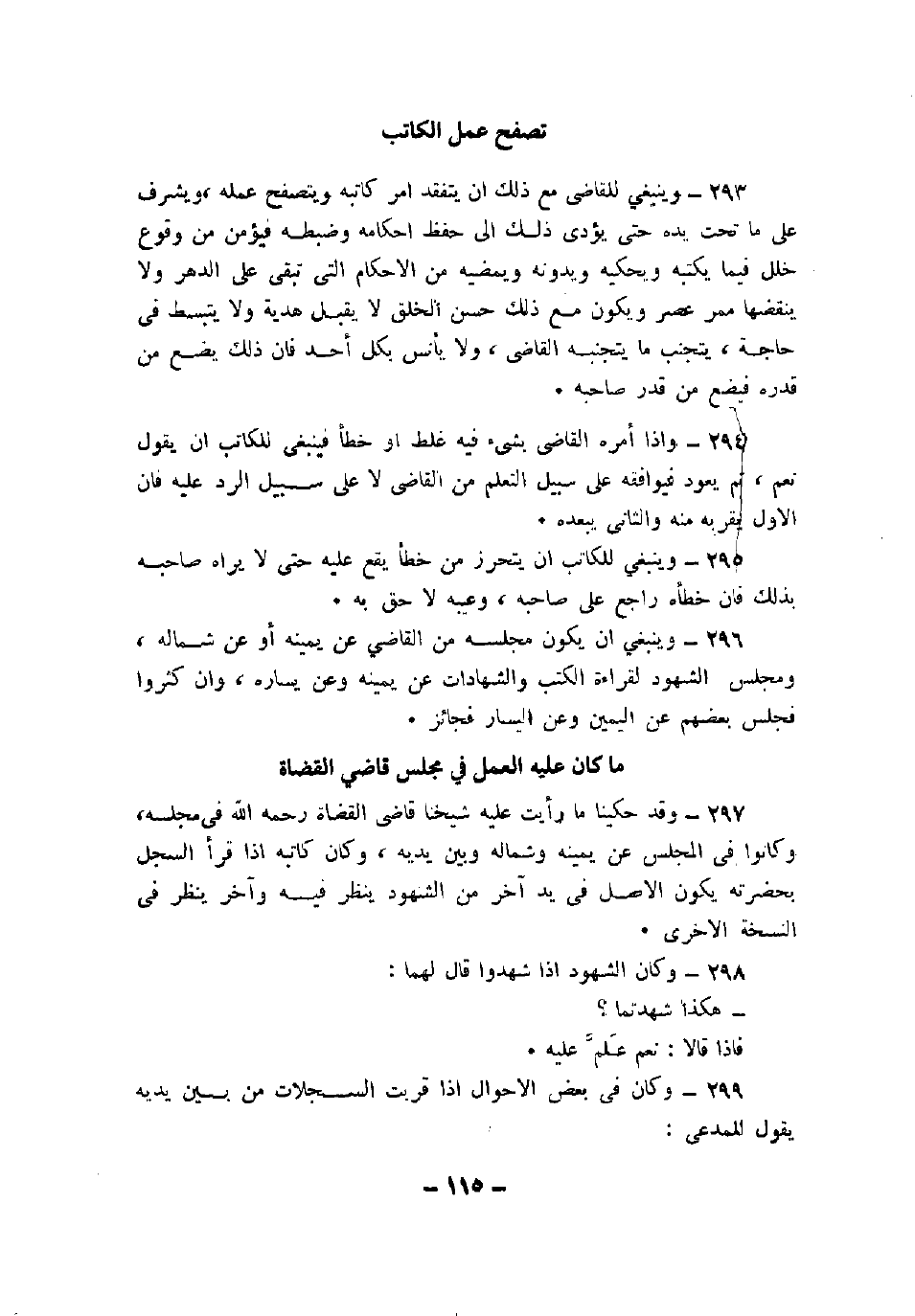 297 - وقد حكينا ما رأيت عليه شيخنا قاضي القضاة رحمه الله في مجلسه، وكانوا في المجلس عن يمينه وشماله وبين يديه، وكان كاتبه إذا قرأ السجل بحضرته يكون الأصل في يد آخر من الشهود ينظر فيه وآخر ينظر فيه النسخة الأخرى.