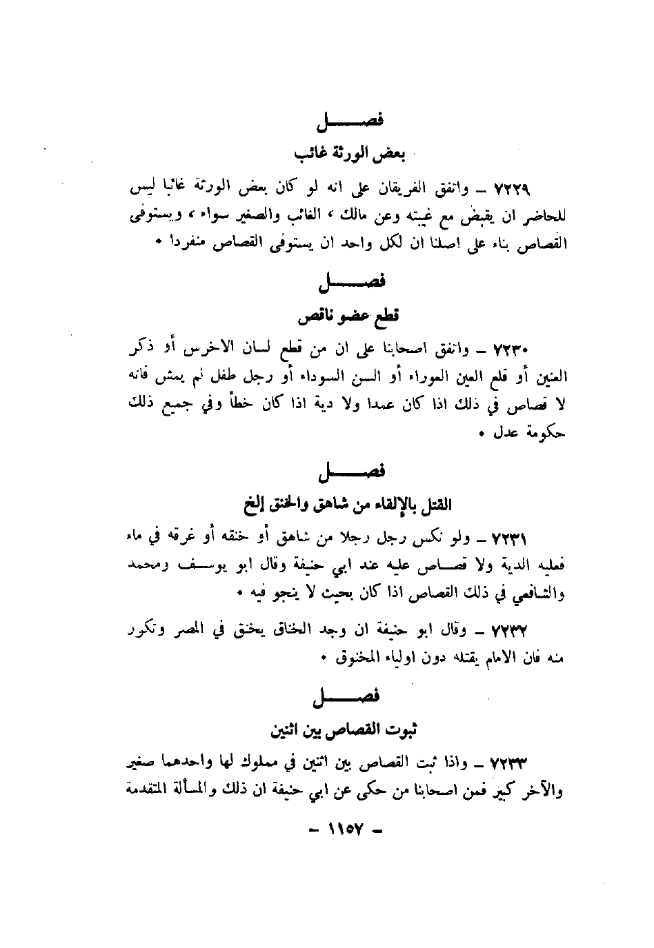 7229 - واتفق الفريقان على أنه لو كان بعض الورثة غائبا ليس للحاضر أن يقبض مع غيبته وعن مالك، الغائب والصغير سواء، ويستوفى القصاص بناء على أصلنا أن لكل واحد أن يستوفى القصاص منفردا.