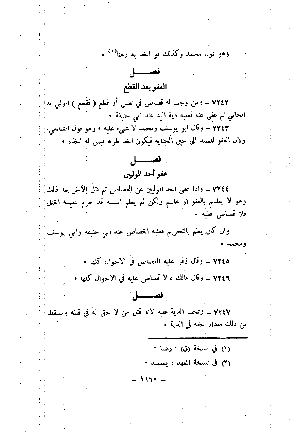 7224 - وإذا عفا أحد الوليين عن القصاص ثم قتل الآخر بعد ذلك وهو بالعفو أو علم ولكن لم يعلم أنه قد حرم عليه القتل فلا قصاص عليه.