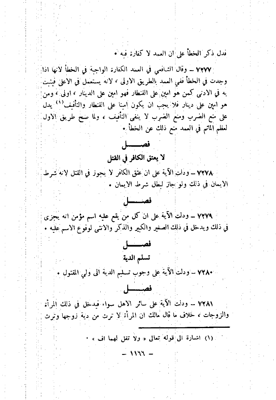 7277 - وقال الشافعي في العمد الكفارة الواجبة في الخطأ لأنها إذا وجدت في الخطأ ففي العمد بالطريق الأولى، لأنه يستعمل في الأعلى فيثبت به في الأدنى كمن هو أمين على القنطار فهو أمين على الدينار، أولى، ومن هو أمين على دينار فلا يجب أن يكون أمينا على القنطار والتأفيف يدل على منع الضرب ومنع الضرب لا ينفى التأفيف، ولما صح طريق الأول لعظم المائم في العمد منع ذلك عن الخطأ.