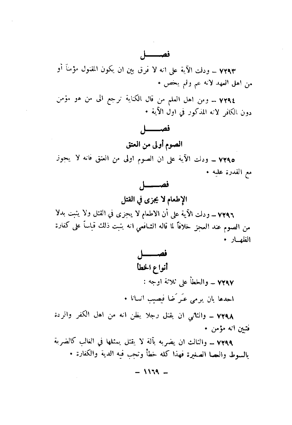 7296 - ودلت الآية على أن الإطعام لا يجزي في القتل ولا يثبت بدلا من الصوم عند العجز خلافاً لما قاله الشافعي أنه يثبت ذلك قياساً على كفارة الظهار.