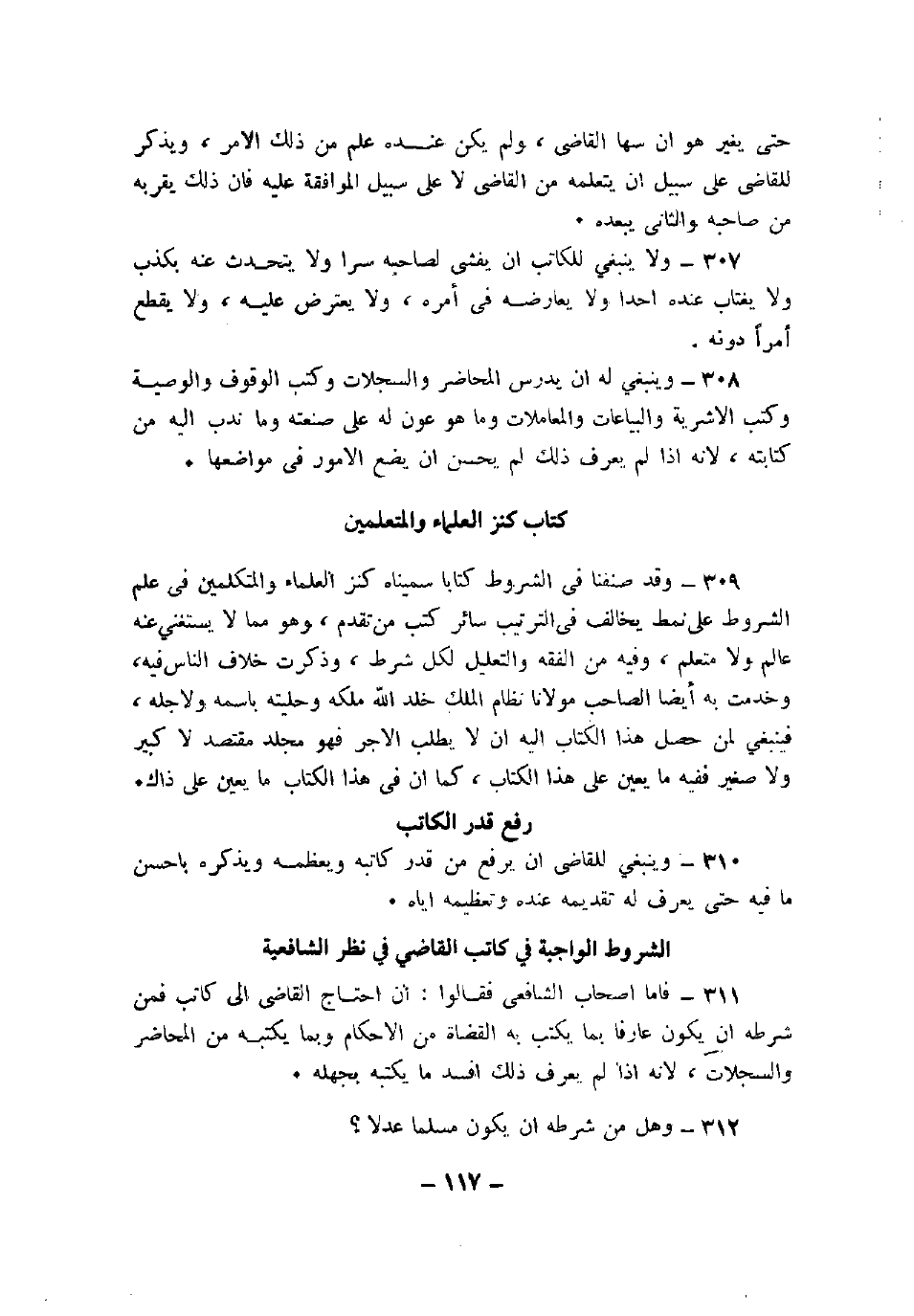311 - فأما أصحاب الشافعي فقالوا: إن احتاج القاضي إلى كاتب فمن شرطه أن يكون عارفًا بما يكتب به القضاة من الأحكام وبما يكتبه من المحاضر والسجلات، لأنه إذا لم يعرف ذلك أفسد ما يكتبه بجهله.