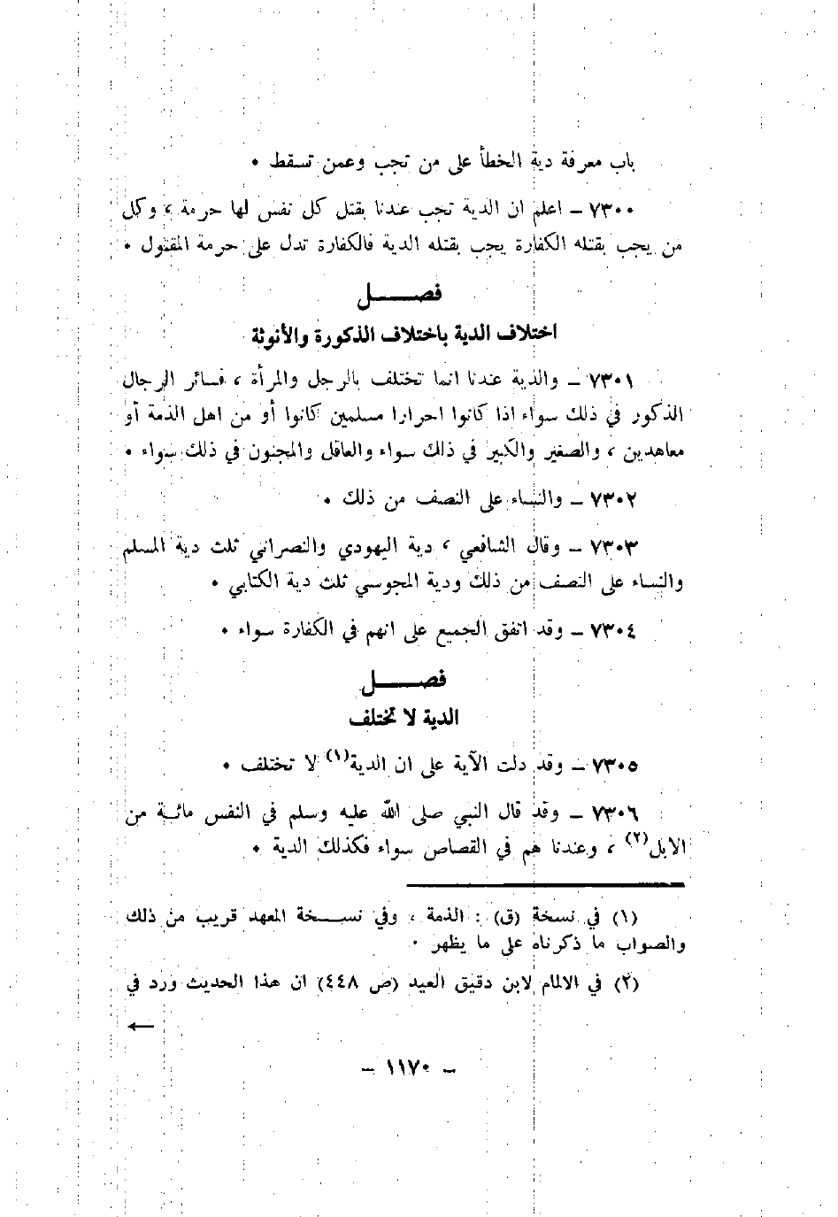 7301 - والدية عندنا إنما تختلف بالرجل والمرأة، فسائر الرجال الذكور في ذلك سواء إذا كانوا أحرارا مسلمين كانوا أو من أهل الذمة أو معاهدين، والصغير والكبير في ذلك سواء والعاقل والمجنون في ذلك سواء.