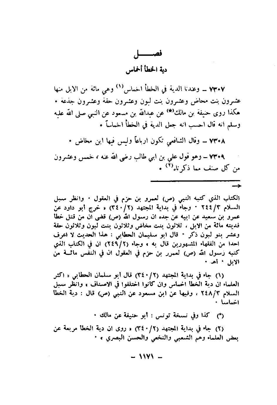 7307 - وعندنا الدية في الخطأ أخماس وهي مائة من الإبل منها عشرون بنت محاض وعشرون بنت لبون وعشرون حقة وعشرون جذعة. هكذا روى حنيفة بن مانك عن عبد الله بن مسعود عن النبي صلى الله عليه وسلم أنه قال أحسب أنه جعل الدية في الخطأ اخماساً.