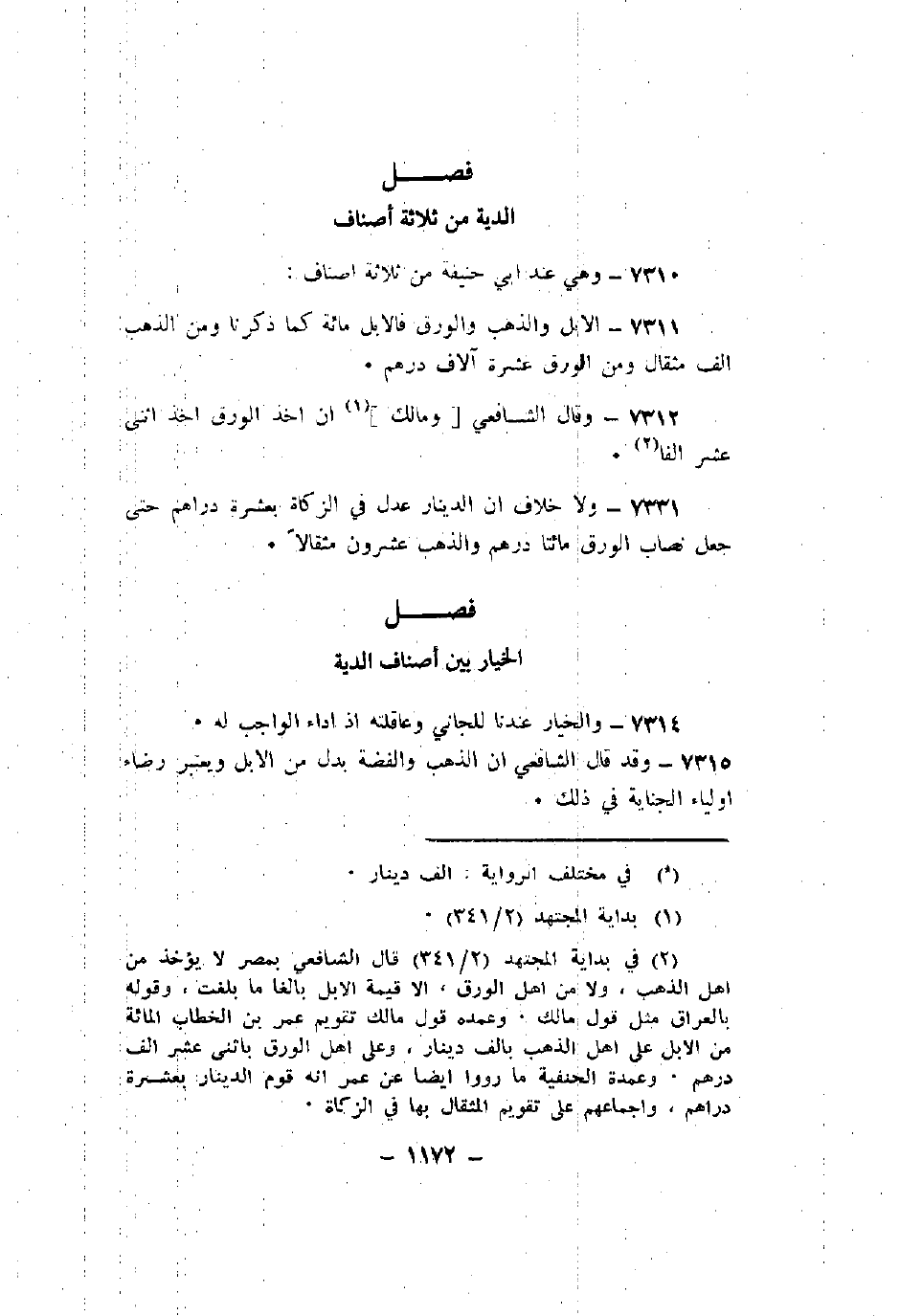 7311 - الإبل والذهب والورق فالإبل مائة كما ذكرنا ومن الذهب ألف مثقال ومن الورق عشرة آلاف درهم.
