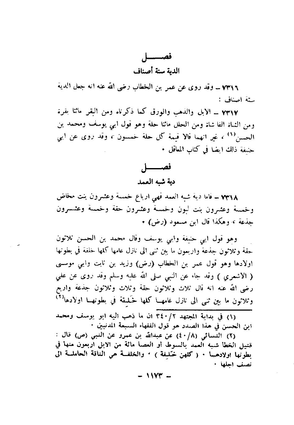 7318 - فأما دية شبه العمد فهي أرباع خمسة وعشرون بنت مخاض وخمسة وعشرون بنت لبون وخمسة وعشرون حقة وخمسة وعشرون جذعة، وهكذا قال ابن مسعود (رض).