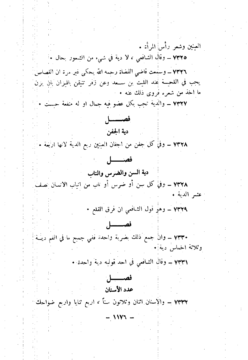 7328 - وفي كل سن أو ضرس أو ناب من أنياب الإنسان نصف عشر الدية.