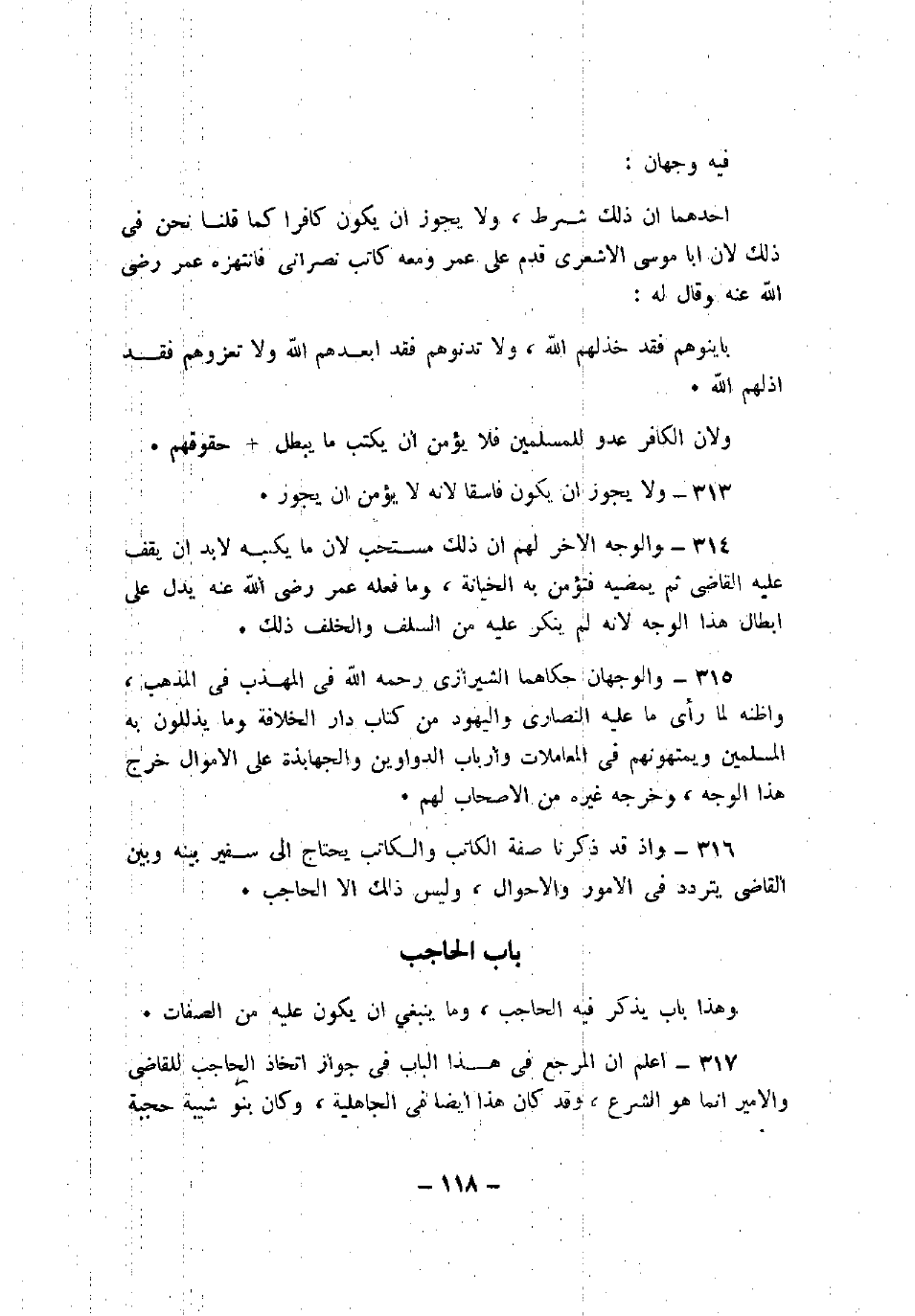 317 - اعلم أن المرجع في هذا الباب في جواز اتخاذ الحاجب للقاضي والأمير إنما هو الشرع، وقد كان هذا أيضًا في الجاهلية، وكان بنو شيبة حجبة