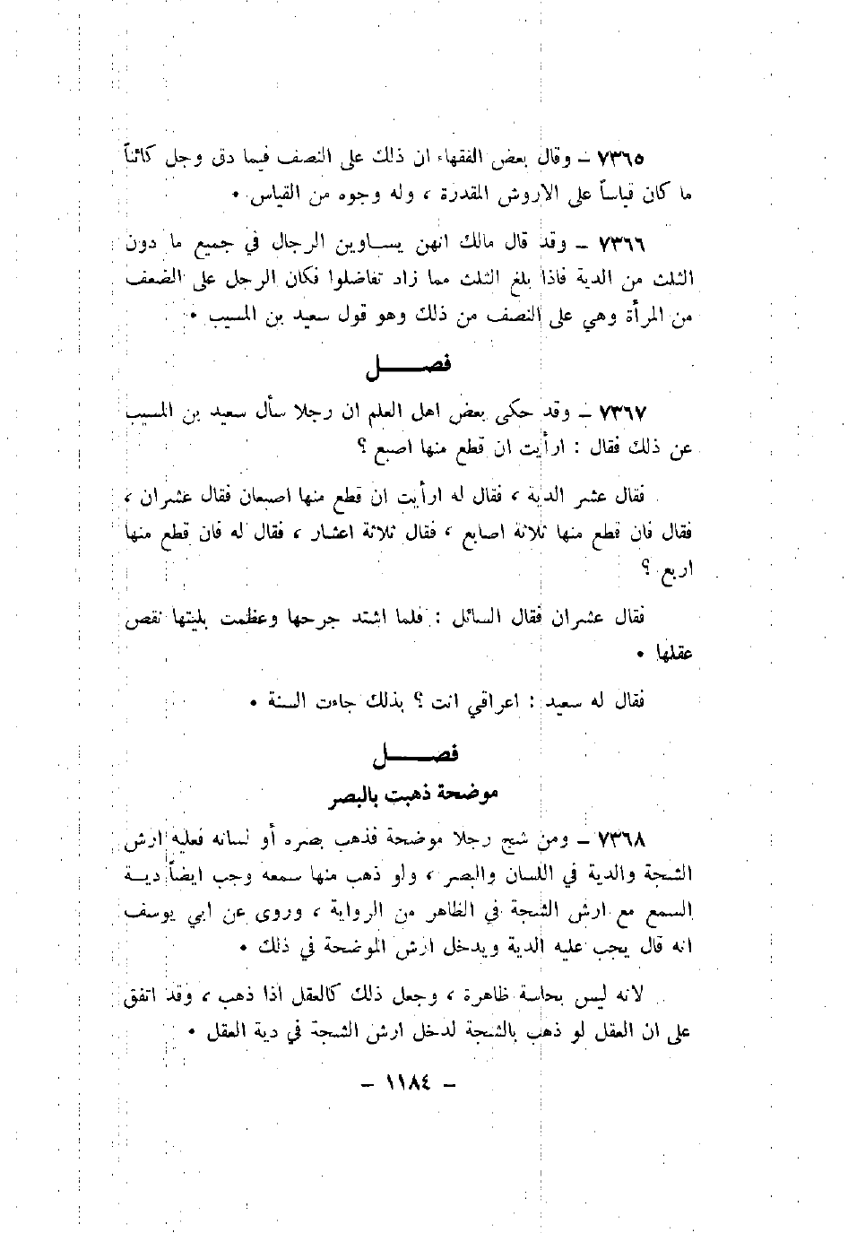 7367 - وقد حكي بعض أهل العلم أن رجلاً سأل سعيد بن المسيب عن ذلك فقال: أرأيت أن قطع منها إصبع؟