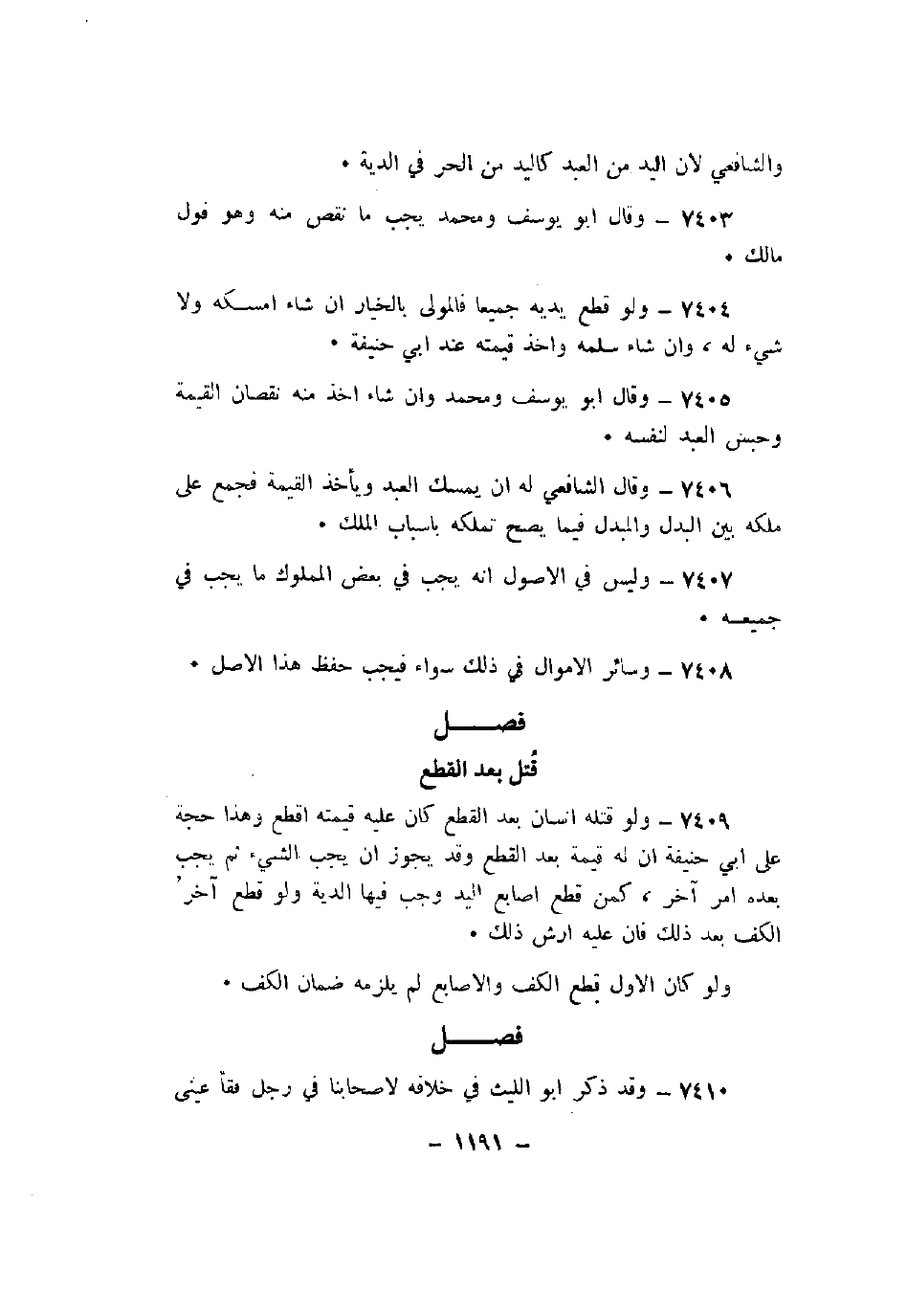 7409 - ولو قتله إنسان بعد القطع كان عليه قيمته اقطع وهذا حجة على أبي حنيفة أن له قيمة بعد القطع وقد يجوز أن يجب الشيء ثم يجب بعده أمر آخر، كمن قطع أصابع اليد وجب فيها الدية ولو قطع آخر الكف بعد ذلك فإن عليه أرش ذلك.