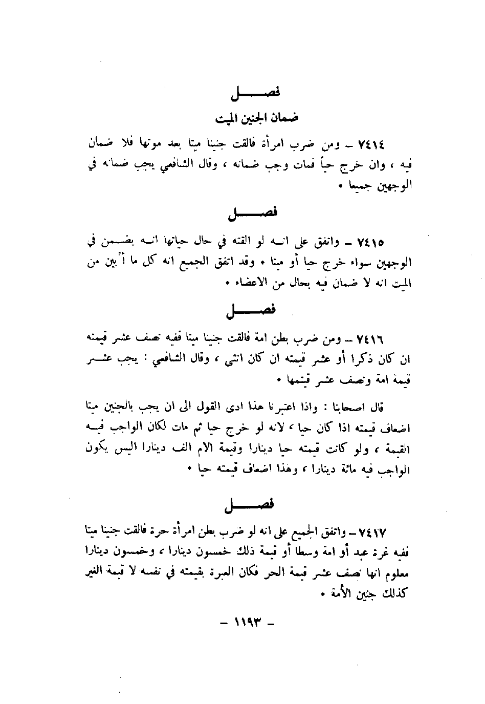 7417 - واتفق الجميع على أنه لو ضرب بطن امرأة حرة فألقت جنينا ميتا ففيه غرة عبد أو أمة وسطا أو قيمة ذلك خمسون دينارا، وخمسون دينارا معلوم أنها نصف عشر قيمة الحر فكان العبرة بقيمته في نفسه لا قيمة الغير كذلك جنين الأمة.