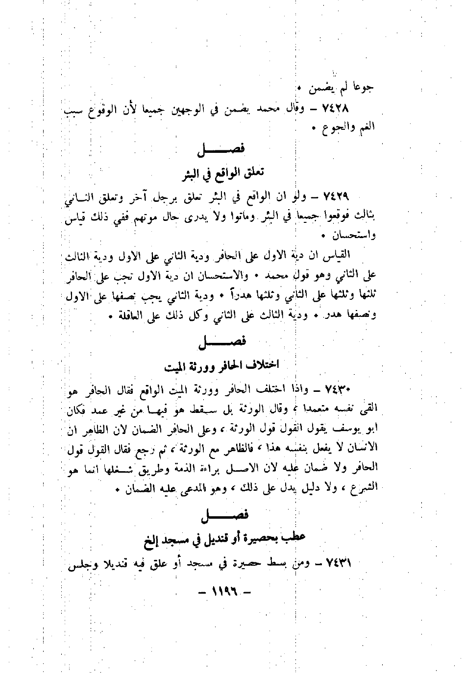 7429 - ولو أن الواقع في البئر تعلق برجل آخر وتعلق الثاني بثالث فوقعوا جميعا في البئر وماتوا ولا يدرى حال موتهم ففي ذلك قياس واستحسان.
