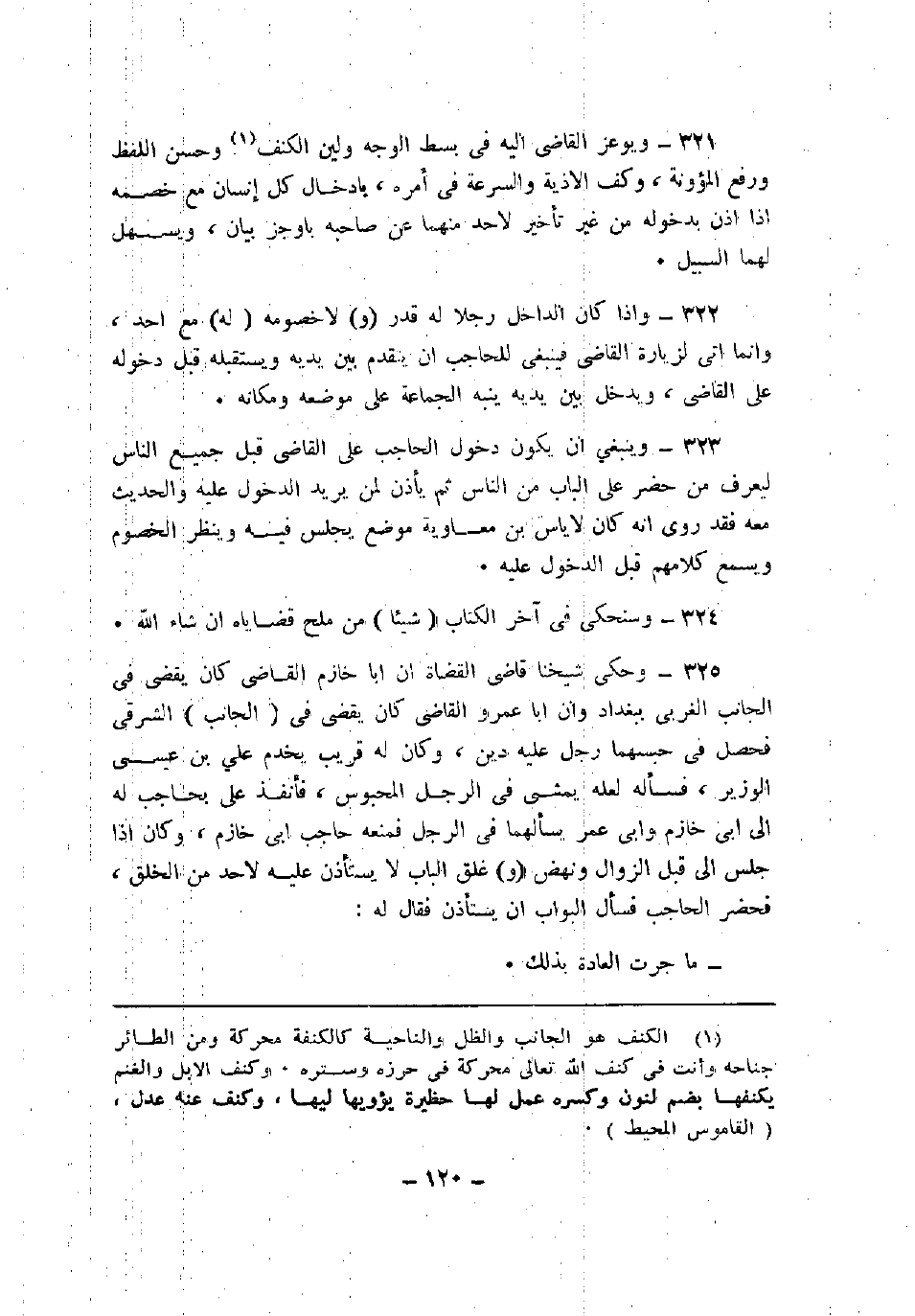 321 - ويوعز القاضي إليه في بسط الوجه ولين الكنف وحسن اللفظ ورفع المؤونة، وكف الأذية والسرعة في أمره، بإدخال كل إنسان مع خصمه إذا أذن بدخوله من غير تأخير لا حد منهما عن صاحبه بأوجز بيان، ويسهل لهما السبيل.