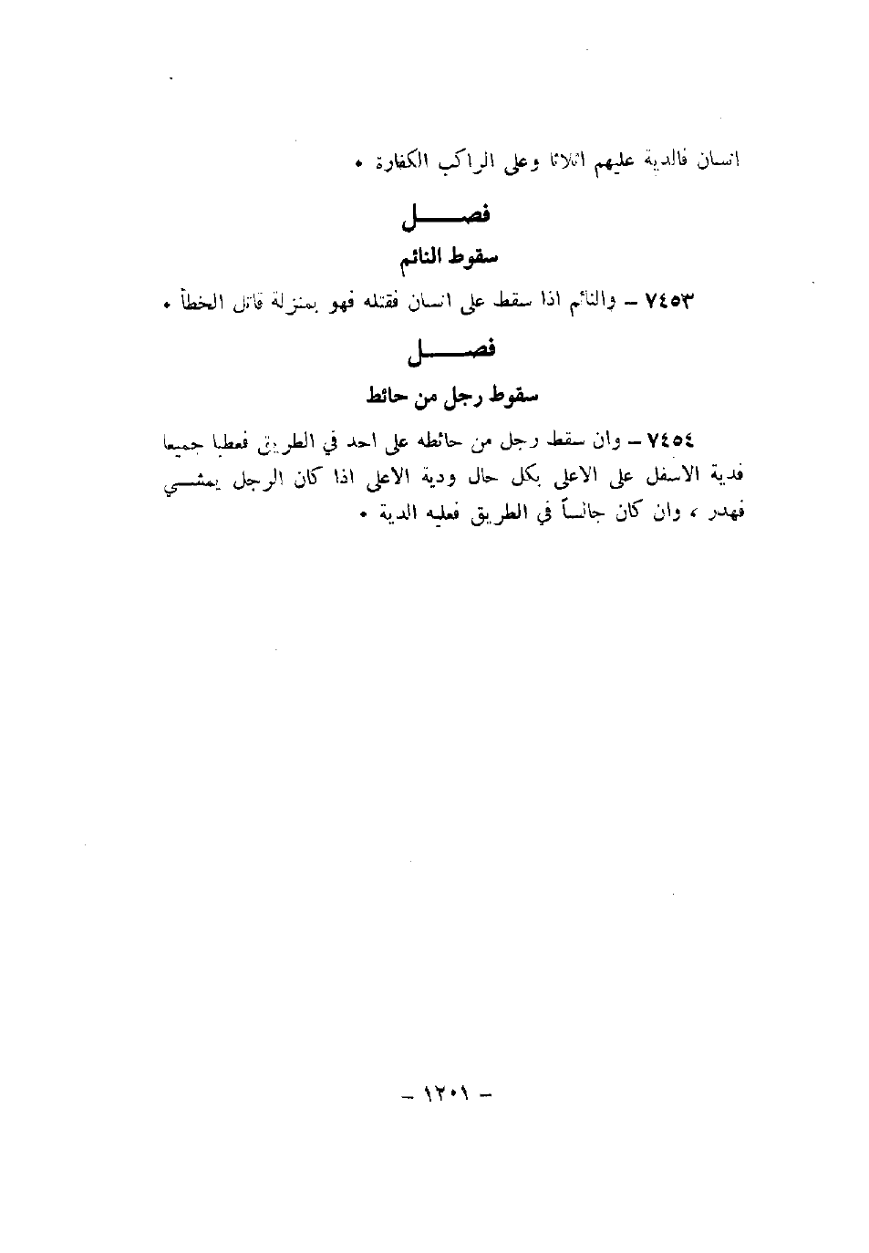 7454 - وإن سقط رجل من حائطه على أحد في الطريق فعطبا جميعا فدية الأسفل على الأعلى بكل حالة ودية الأعلى إذا كان الرجل يمشي فهدر، وإن كان جانباً في الطريق فعليه الدية.