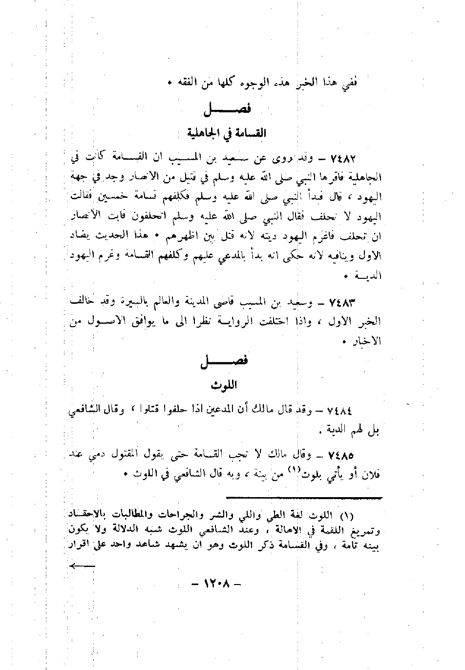 7482 - وقد روى عن سعيد بن المسيب أن القسامة كانت في الجاهلية فأقرها النبي صلى الله عليه وسلم في قتيل من الأنصار وجد في جهة اليهود، قال فبدأ النبي صلى الله عليه وسلم فكلفهم قسامة خمسين فقالت اليهود لا تحلف فقال صلى الله عليه وسلم أتحلفون فابت الأنصار أن تحلف فأغرم اليهود ديته لأنه قتل بين أظهرهم. هذا الحديث يضاد الأول وينافيه لأنه حكي أنه بدأ بالمدعي عليهم وكلفهم القسامة وغرم اليهود الدية.