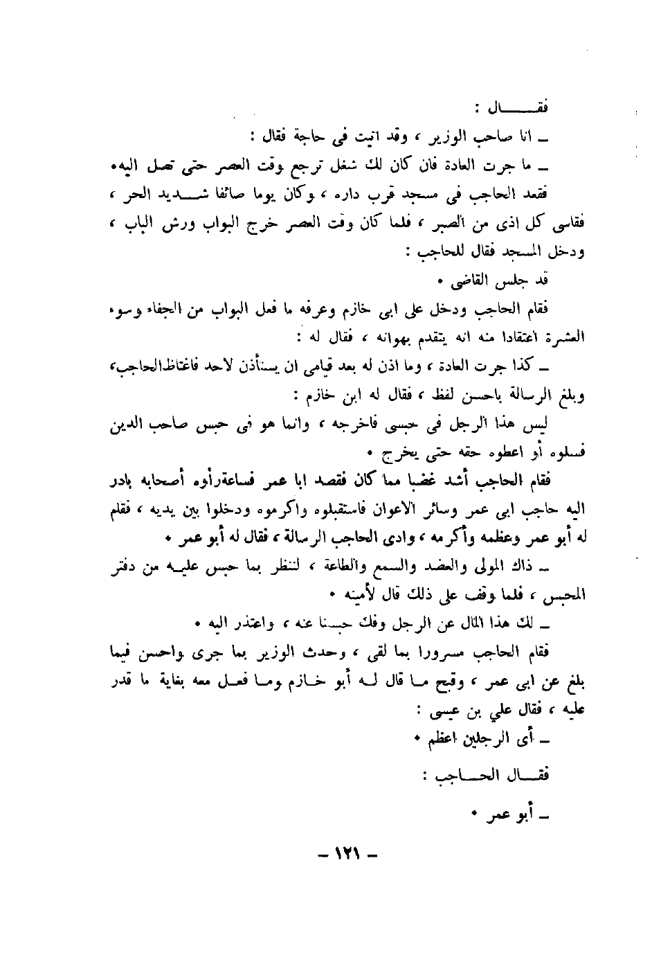 فقام الحاجب مسرورًا بما لقي، وحدث الوزير بما جرى وأحسن فيما بلغ عن أبى عمر، وقبح ما قال له أبو خازم وما فعل معه بغاية ما قدر عليه، فقال علي بن عيسى: