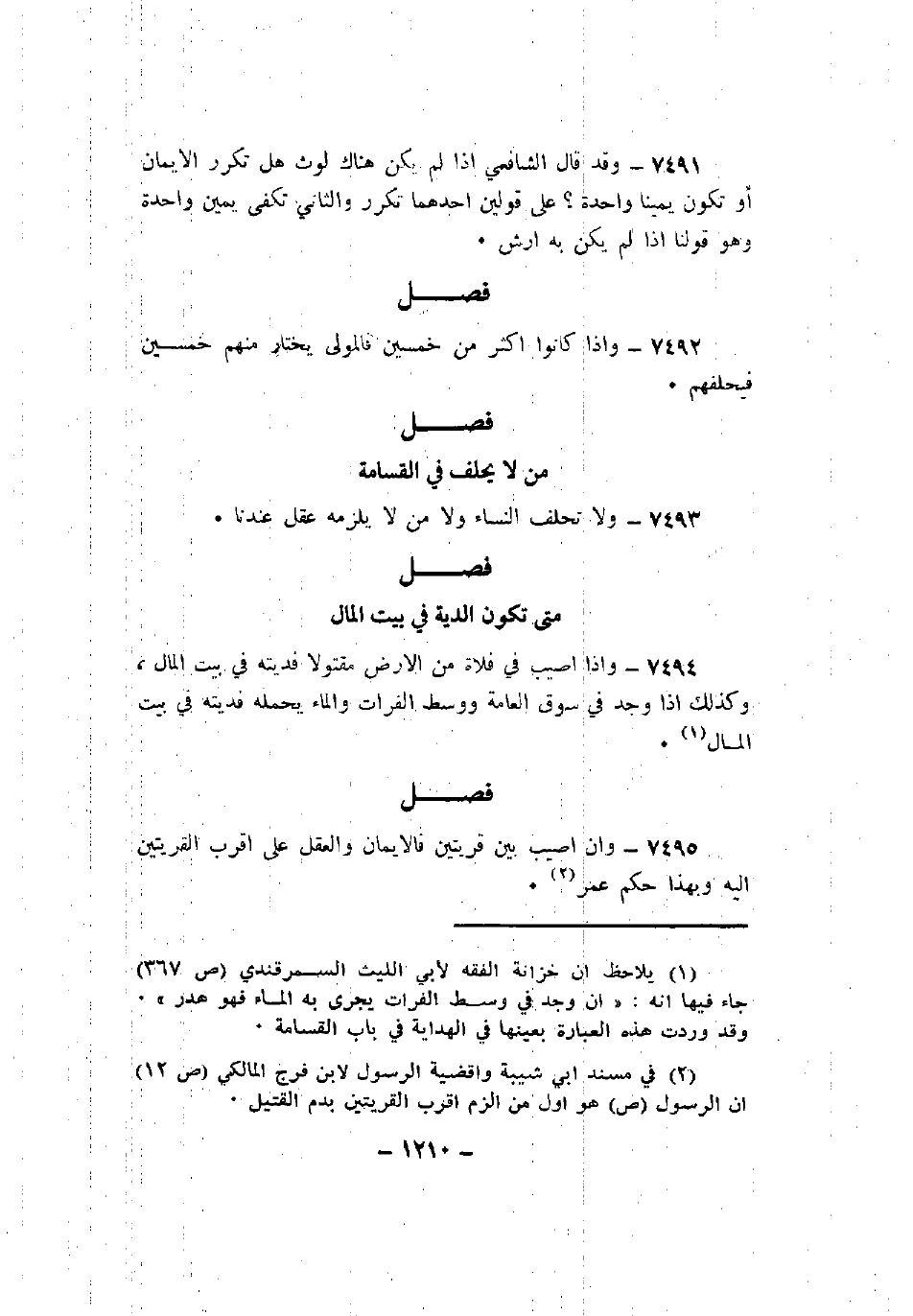 7494 - وإذا أصيب في فلاة من الأرض مقتولا فديته في بيت المال، وكذلك إذا وجد في سوق العامة ووسط الفرات والماء يحمله فديته في بيت المال.