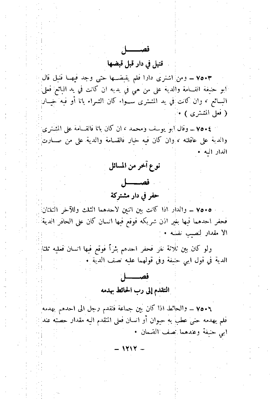 7505 - والدار إذا كانت بين اثنين لأحدهما الثلث والآخر الثلثان فحفر أحدهما فيها بغير إذن شريكه فوقع فيها إنسان كان على الحافر الدية إلا مقدار لنصيب نفسه.