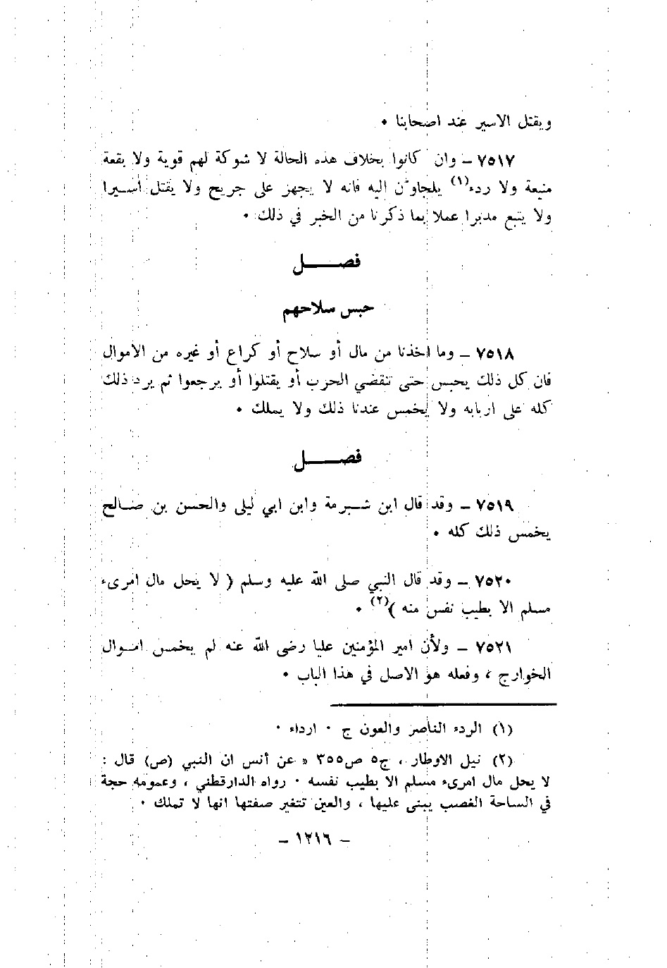 7518 - وما أخذنا من مال أو سلاح أو كراع أو غيره من الأموال فإن كل ذلك يحبس حتى تنقضي الحرب أو يقتلوا أو يرجعوا ثم يرد ذلك كله على أربابه ولا يخمس عندنا ذلك ولا يملك.