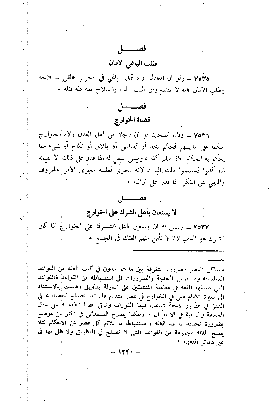 7536 - وقال أصحابنا لو أن رجلاً من أهل العدل ولاه الخوارج حكماً على مدينتهم فحكم بحد أو قصاص أو طلاق أو نكاح أو شيء مما يحكم به الحكام جاز ذلك كله، وليس ينبغي له إذا قدر على ذلك إلا بقيمه إذا كانوا قد سلموا ذلك إليه، لأنه يجري فعله مجرى الأمر بالمعروف والنهي عن المنكر إذا قدر على إزالته.