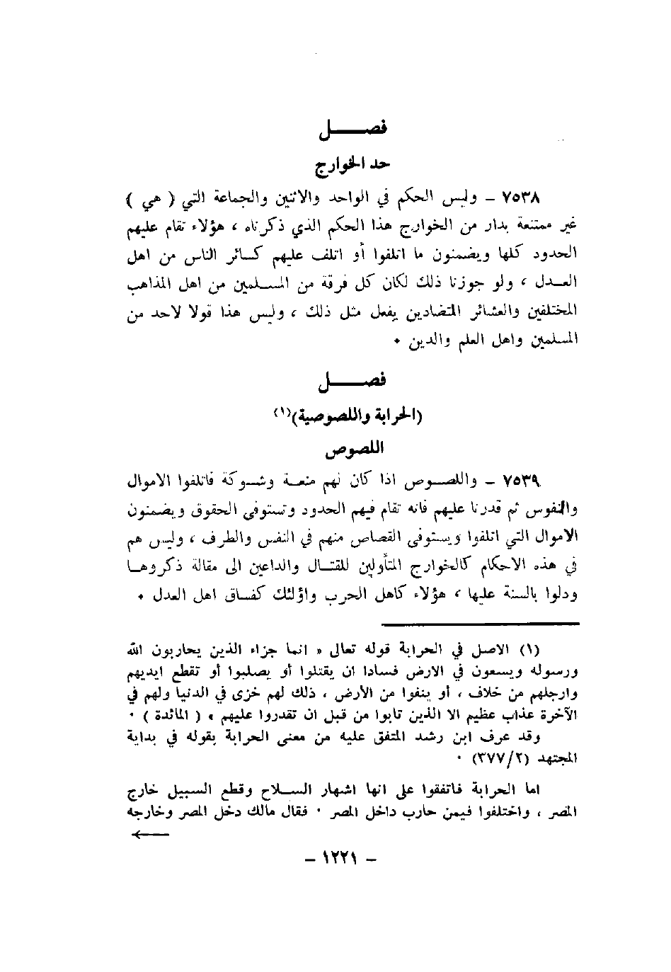 7539 - واللصوص إذا كان لهم منعة وشوكة فاتلفوا الأموال والنفوس ثم قدرنا عليهم فإنه تقام فيهم الحدود وتستوفى الحقوق ويضمنون الأموال التي اتلفوا ويستوفى القصاص منهم في النفس والطرف، وليس هم في هذه الأحكام كالخوارج المتأولين للقتال والداعين إلى مقالة ذكروها ودلوا بالسنة عليها، هؤلاء كأهل الحرب واؤلئك كفساق أهل العدل.