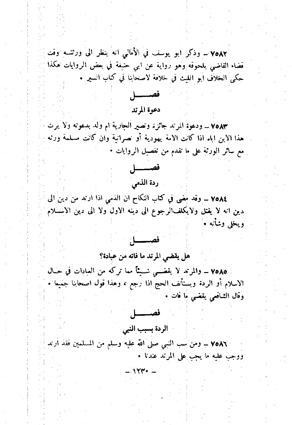 7584 - وقد مضى في كتاب النكاح أن الذمي إذا ارتد من دين إلى دين أنه لا يقتل ولا يكلف الرجوع إلى دينه الأول ولا إلى دين الإسلام ويخلى وشأنه.