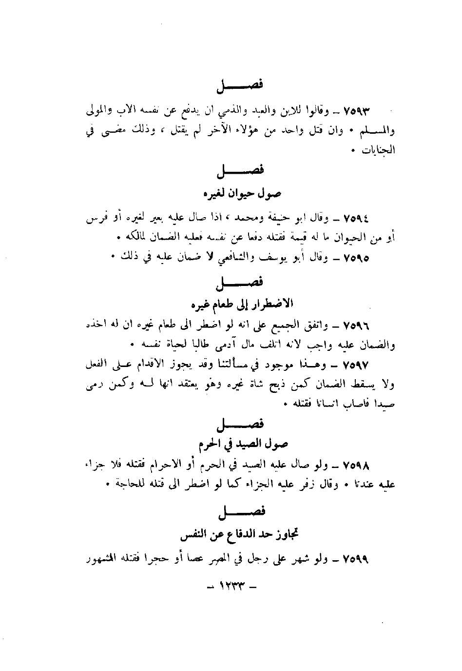 7594 - وقال أبو حنيفة ومحمد، إذا صال عليه بعير لغيره أو فرس أو من الحيوان ما له قيمة فقتله دفعاً عن نفسه فعليه الضمان لمالكه.