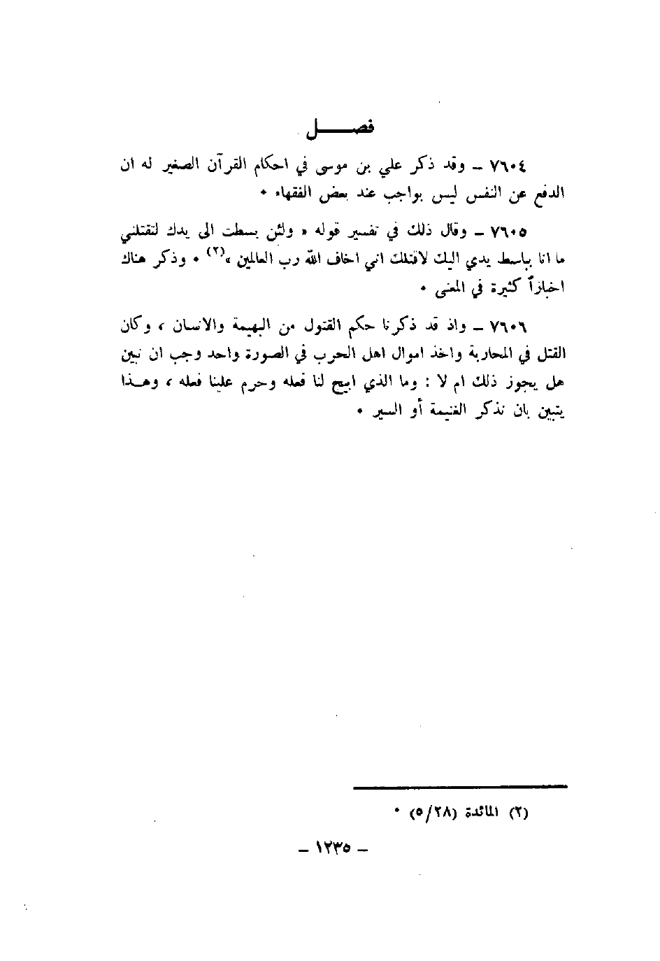 7604 - وقد ذكر علي بن موسى في أحكام القرآن الصغير له أن الدفع عن النفس ليس بواجب عند بعض الفقهاء.