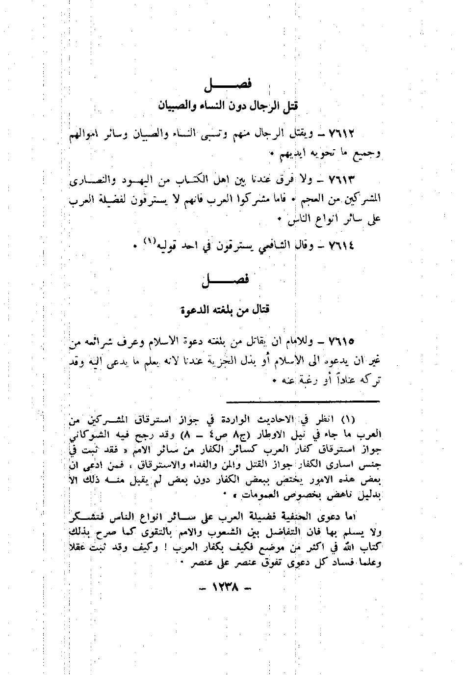 7613 - ولا فرق عندنا بين أهل الكتاب من اليهود والنصارى المشركين من العجم. فأما مشركوا العرب فإنهم لا يسترقون لفضيلة العرب على سائر أنواع الناس.