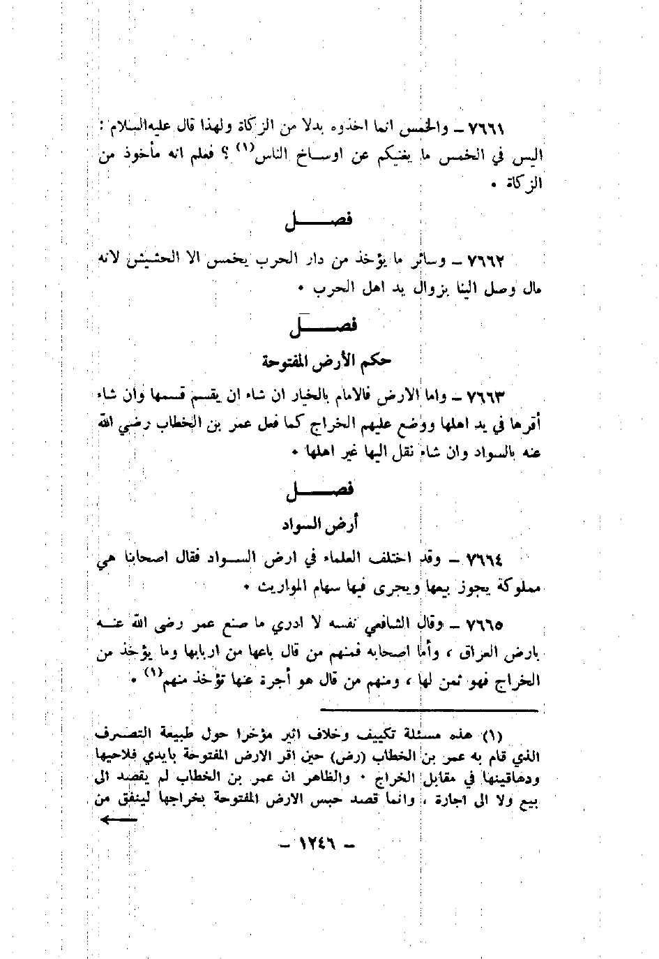 7664 - وقد اختلف العلماء في أرض السواد فقال أصحابنا هي مملوكة يجوز بيعها ويجري فيها سهام المواريث.