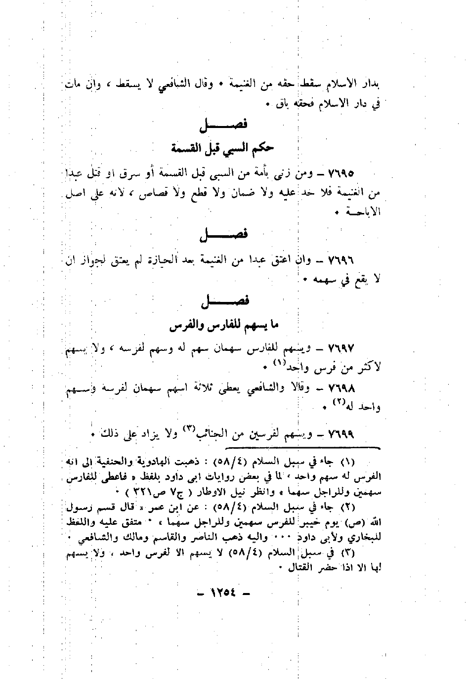 7697 - ويسهم للفارس سهمان سهم له وسهم لفرسه، ولا يسهم لأكثر من فرس واحد.