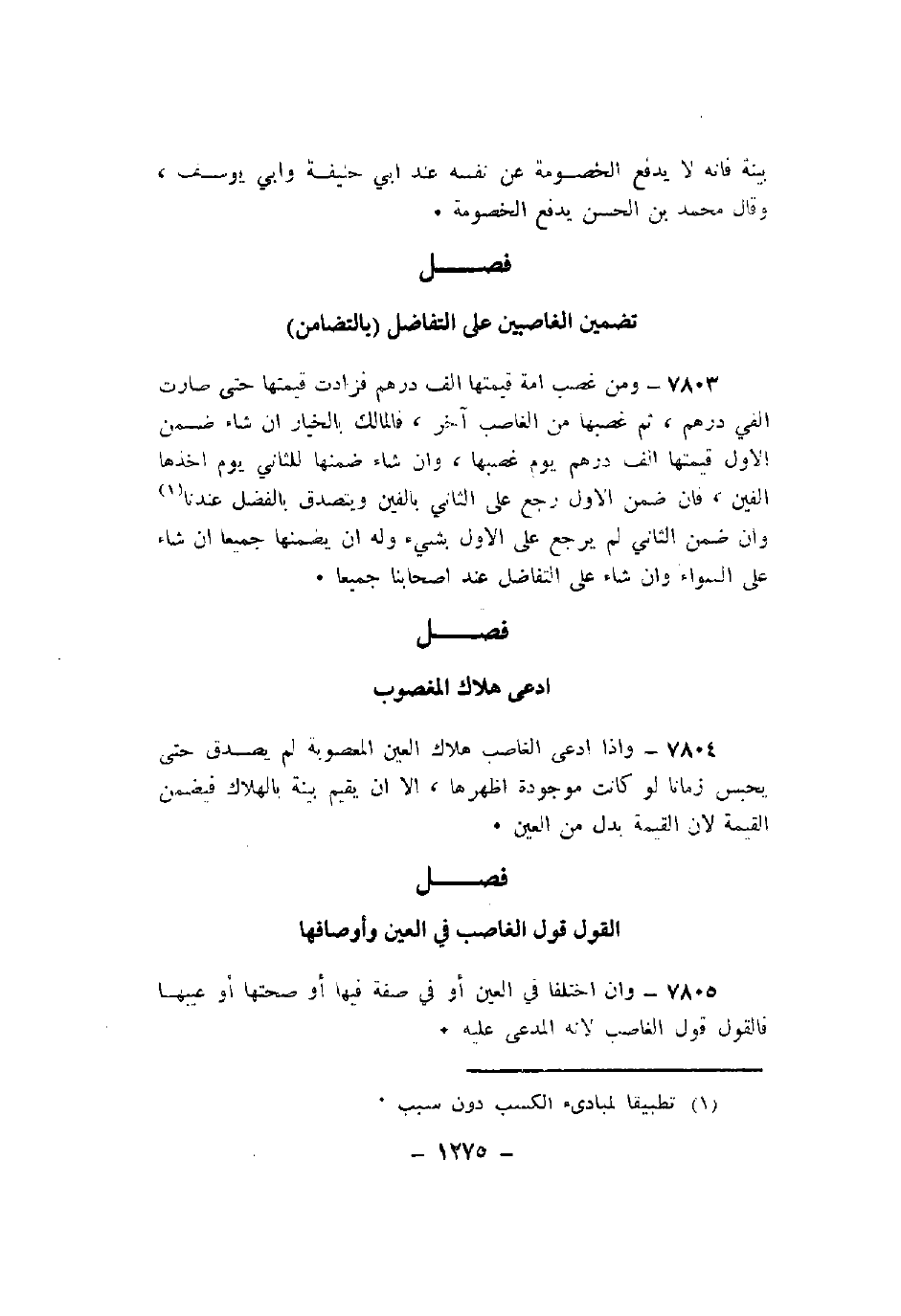 7805 - وإن اختلفا في العين أو في صفة فيها أو صحتها أو عيبها فالقول قول الغاصب لأنه المدعى عليه.