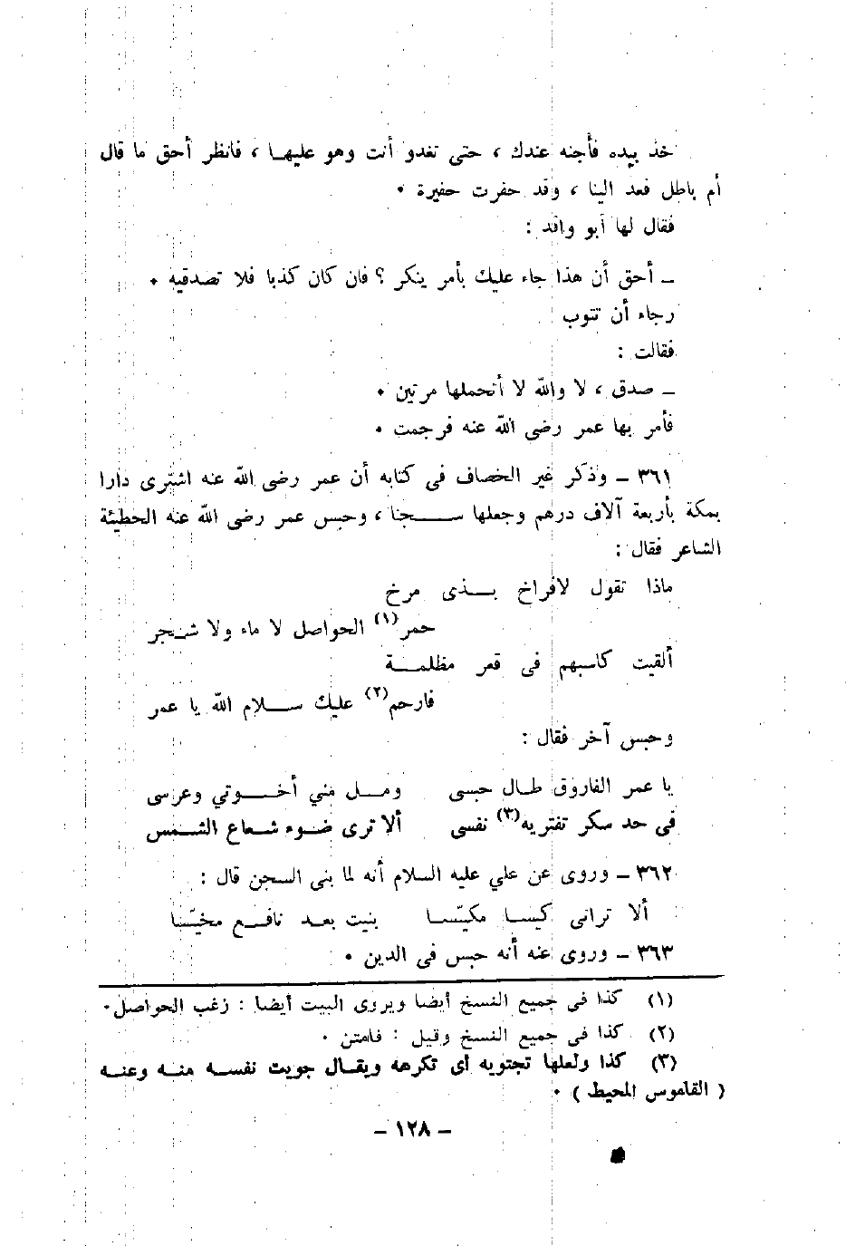 361 - وذكر غير الخصاف في كتابه أن عمر رضي الله عنه اشترى داراً بمكة بأربعة آلاف درهم وجعلها سجناً، وحبس عمر رضي الله عنه الخطيئة الشاعر فقال: