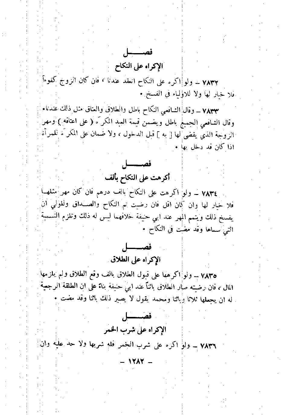 7833 - وقال الشافعي النكاح باطل والطلاق والعتاق مثل ذلك عندنا. وقال الشافعي الجميع باطل ويضمن قيمة العبد المكره (على اعتاقه) ومهر الزوجة الذي يقضى لها [به] قبل الدخول، ولا ضمان على المكر. للمرأة إذا كان قد دخل بها.