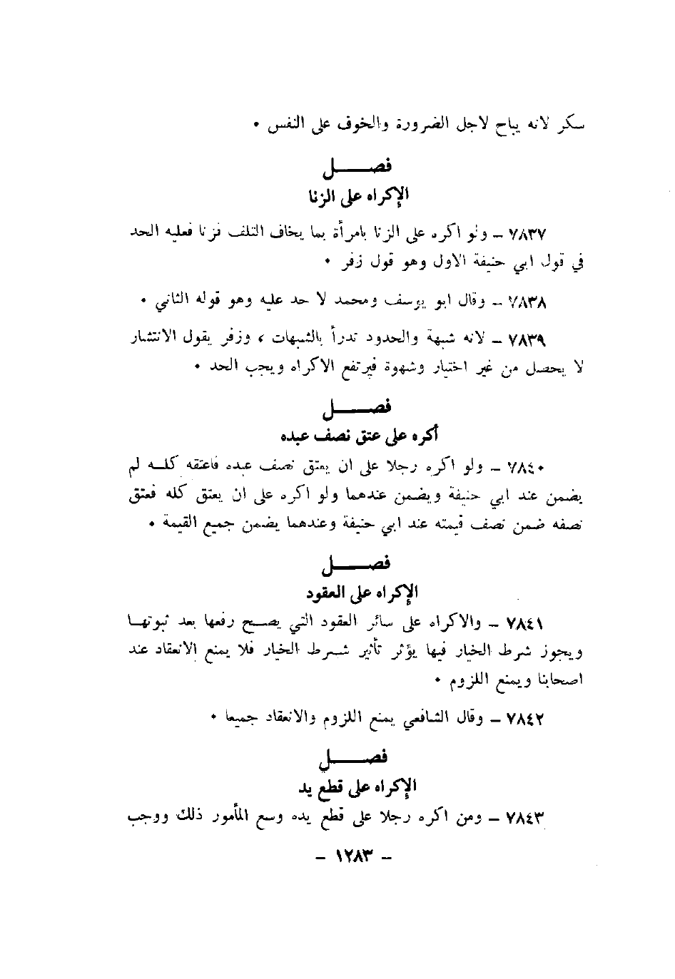 7837 - ولو أكره على الزنا بامرأة بما يخاف التلف فزنا فعليه الحد في قول أبي حنيفة الأول وهو قول زفر.