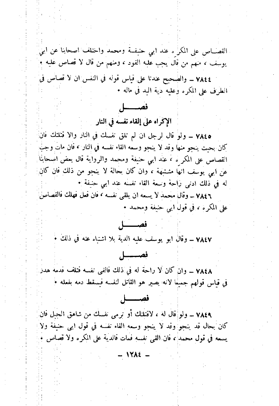 7845 - ولو قال لرجل أن لم تلق نفسك في النار وإلا قتلتك فإن كان بحيث ينجو منها وقد لا ينجو وسعه إلقاء نفسه في النار، فإن مات وجب القصاص على المكره، عند أبي حنيفة ومحمد والرواية قال أصحابنا عن أبي يوسف أنها مشتبهة، وإن كان بحالة لا ينجو من ذلك فإن كان له في ذلك أدنى راحة وسعة إلقاء نفسه عند أبي حنيفة.