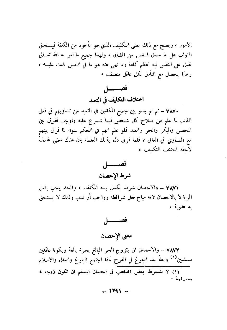 7872 - والإحصان أن يتزوج الحر البالغ بحرة بالغة ويكونا عاقلين سلمين ويطأ بعد البلوغ في الفرج فإذا اجتمعا البلوغ والعقل والإسلام