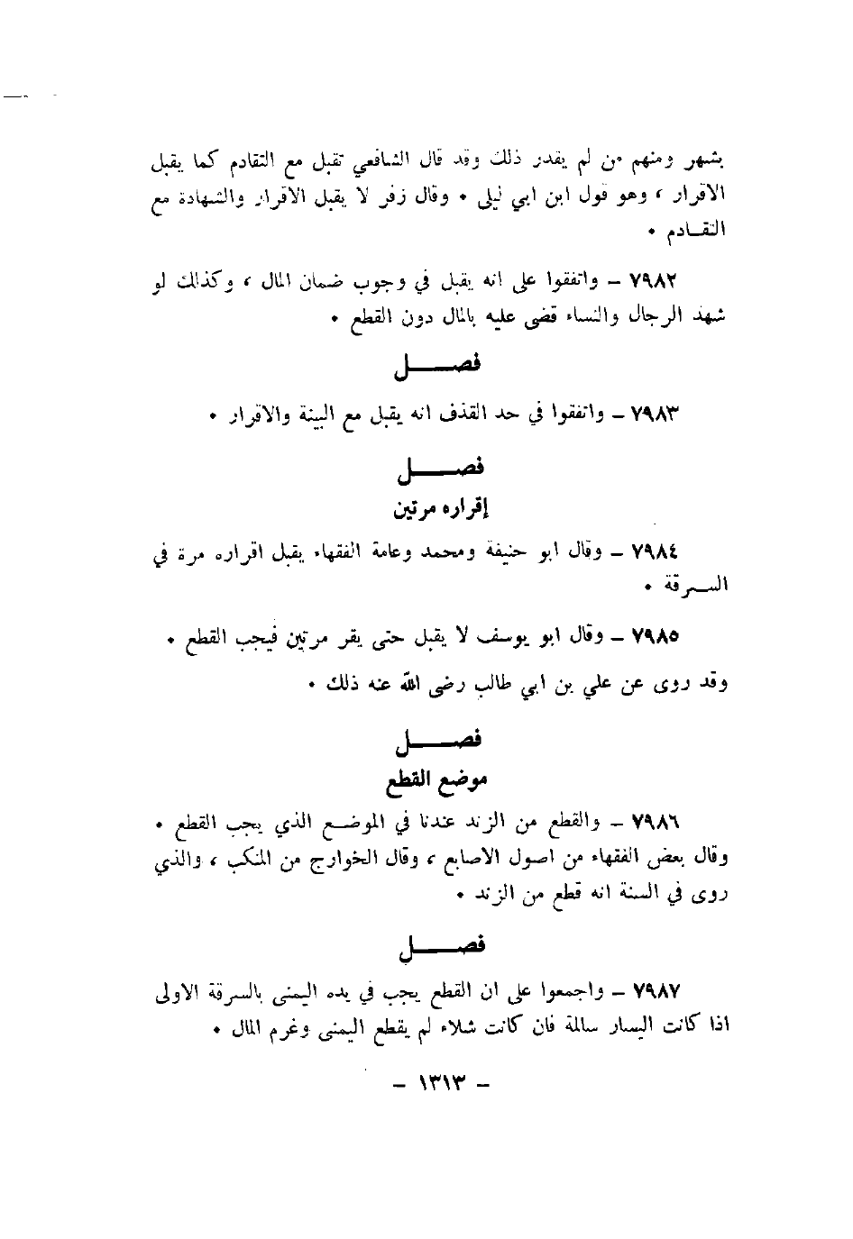 7986 - والقطع من الزند عندنا في الموضع الذي يجب القطع. وقال بعض الفقهاء من أصول الأصابع، وقال الخوارج من المنكب، والذي روى في السنة أنه قطع من الزند.