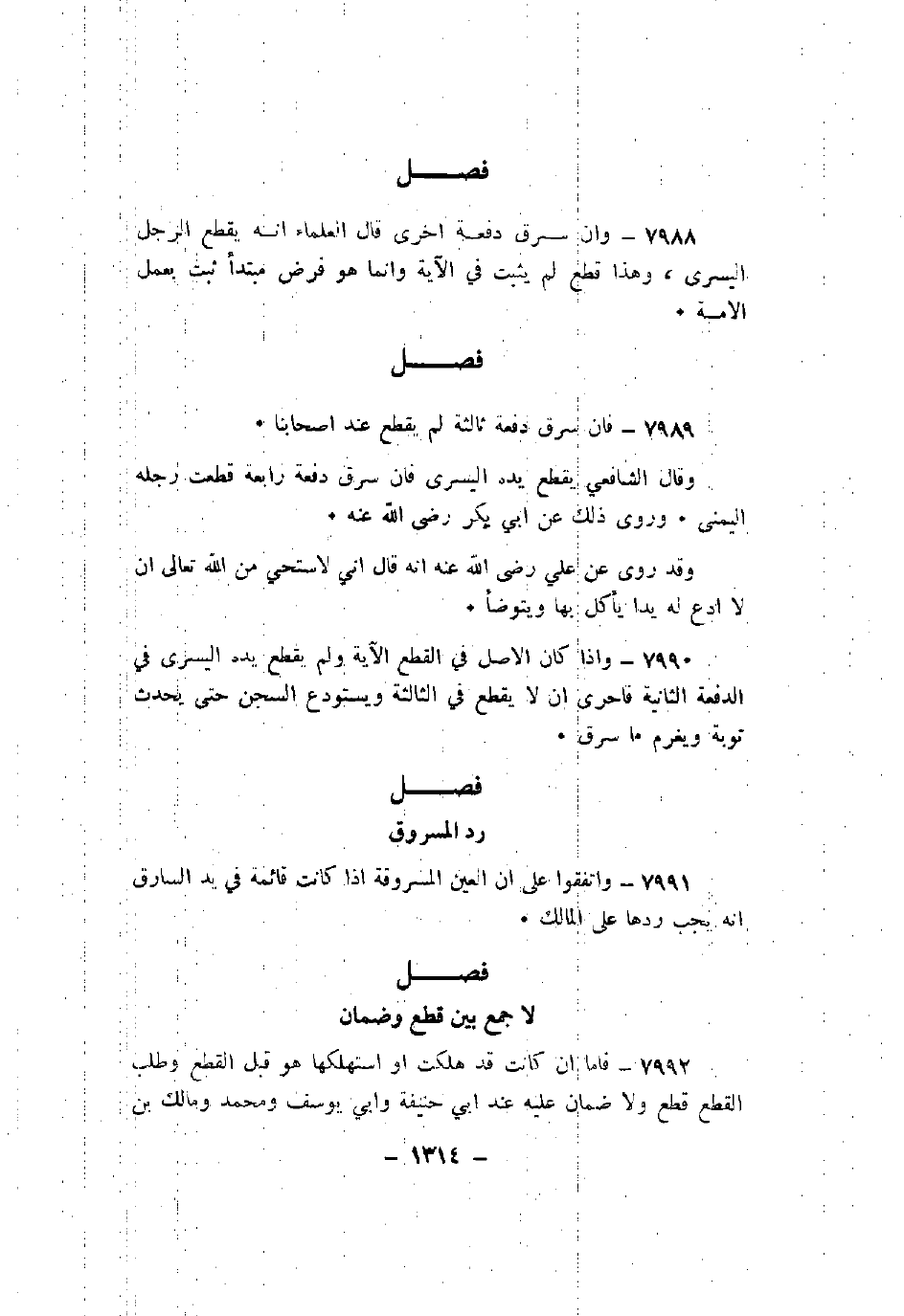 7790 - وإذا أكل الأصل في القطع الآية ولم يقطع يده اليسرى في الدفعة الثانية فأحرى أن لا يقطع في الثالثة ويستودع السجن حتى يحدث توبة ويغرم ما سرق.