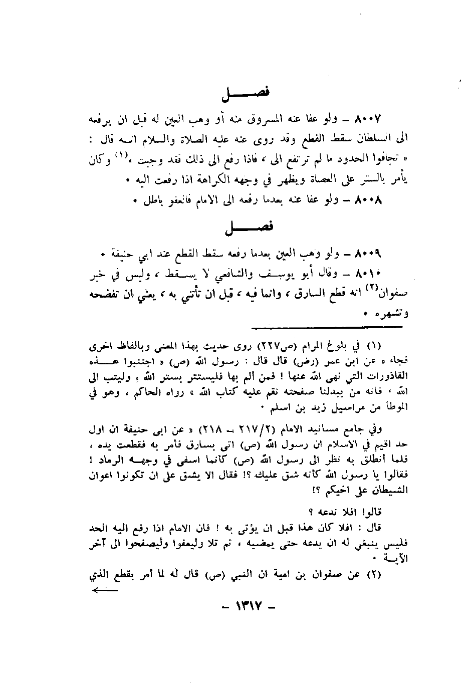 8007 - ولو عفا عنه المسروق أو وهب العين له قبل أن يرفعه إلى السلطان سقط القطع وقد روى عنه عليه الصلاة والسلام أنه قال: «تجافوا الحدود ما لم ترفع إلي، فإذا رفع إلى ذلك فقد وجبت» وكان يأمر بالستر على العصاة ويظهر في وجهه الكراهة إذا رفعت إليه.