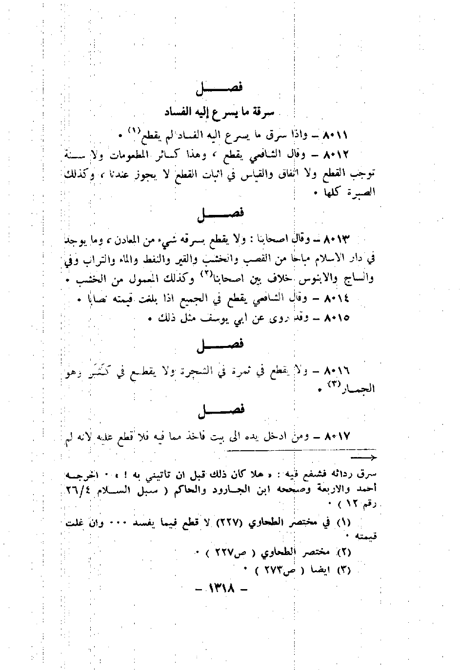 8013 - وقال أصحابنا: ولا يقطع بسرقة شيء من المعادن، وما يوجد في دار الإسلام مباحا من القصب والخشب والقير والنفط والماء والتراب وفي والساج والأبنوس خلاف بين أصحابنا وكذلك المعمول من الخشب.