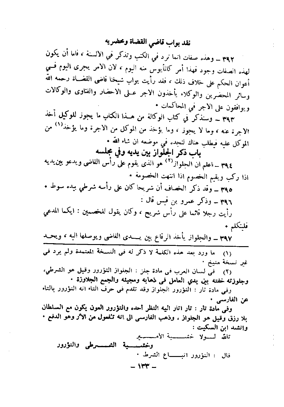 394 - اعلم ان الجلواز هو الذي يقوم علي رأس القاضي ويدعو بين يديه إذا ركب ويقيم الخصوم إذا انتهت الخصومة.