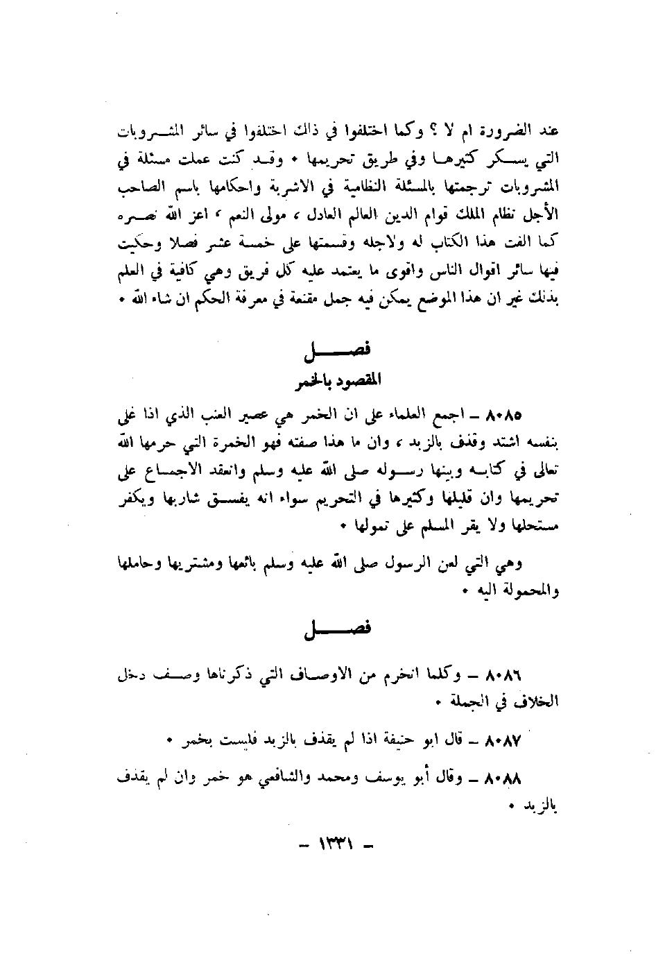 عند الضرورة أم لا؟ وكما اختلفوا في ذاك اختلفوا في سائر المشروبات التي يسكر كثيرها وفي طريقة تحريمها. وقد كانت عملت مسئلة في المشروبات ترجمتها بالمسئلة النظامية في الأشربة وأحكامها باسم الصاحب الأجل نظام الملك قوام الدين العالم العادل، ومولى النعم، أعز الله نصره كما ألفت هذا الكتاب له ولأجله وقسمتها على خمسة عشر فصلا وحكيت فيها سائر أقوال الناس وأقوى ما يعتمد عليه كل فريق وهي كافية في العلم بذلك غير أن هذا الموضع يمكن فيه جمل مقنعة في معرفة الحكم إن شاء الله.