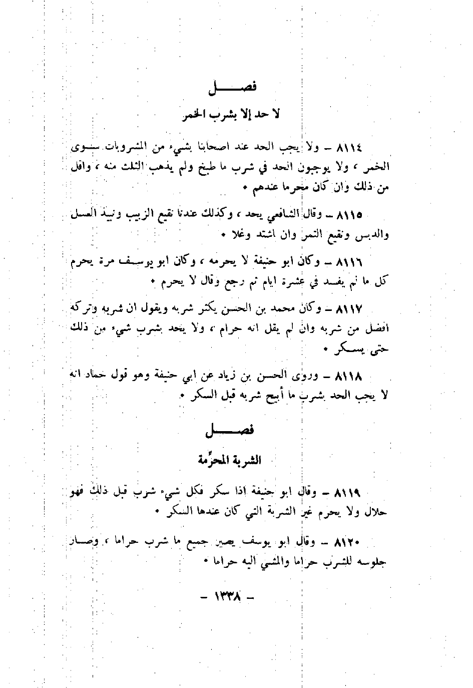 8114 - ولا يجب الحد عند أصحابنا بشيء من المشروبات سوى الخمر، ولا يوجبون الحد في شرب ما طبخ ولم يذهب الثلث منه، وأقل من ذلك، وإن كان محرما ما عندهم.