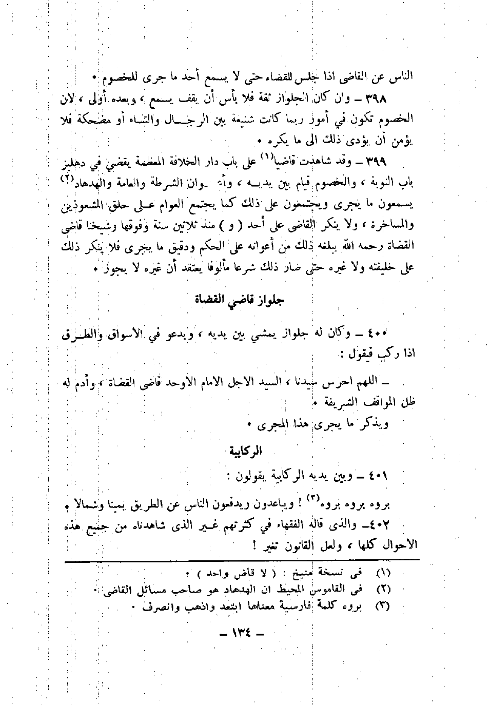 399 - وقد شاهدت قاضيا علي باب دار الخلافة المعظمة يقضي في دهليز باب النوبة، والخصوم قيام بين يديه، وأعوان الشرطة والعامة والهدهاد يسمعون ما يجري ويجتمعون على ذلك كما يجتمع العوام على حلق المشعوذين والمساخرة، ولا ينكر القاضي على أحد (و) منذ ثلاثين سنة وفوقها وشيخنا قاضي القضاة رحمه الله يبلغه ذلك من أعوانه على الحكم ودقيق ما يجري فلا ينكر ذلك على خليفته ولا غيره حتى صار ذلك شرعا مألوفا يعتقد أن غيره لا يجوز.