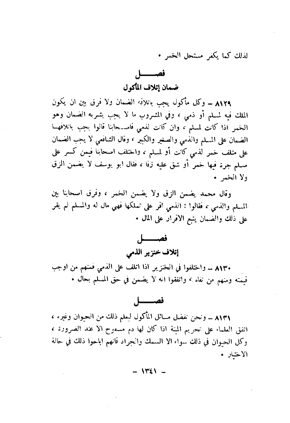 8129 - وكل مأكول يجب بإتلافه الضمان ولا فرق بين أن يكون الملك فيه لمسلم أو ذمي، وفي المشروب ما لا يجب بشربه الضمان وهو الخمر إذا كانت لمسلم، وإن كانت لذمي فأصحابنا قالوا يجب بإتلافها الضمان على المسلم والذمي والصغير والكبير، وقال الشافعي لا يجب الضمان على متلف خمر لذمي كانت أو لمسلم، واختلف أصحابنا فيمن كسر على مسلم جرة فيها خمر أو شق عليه زقا، فقال أبو يوسف لا يضمن الزق ولا الخمر.