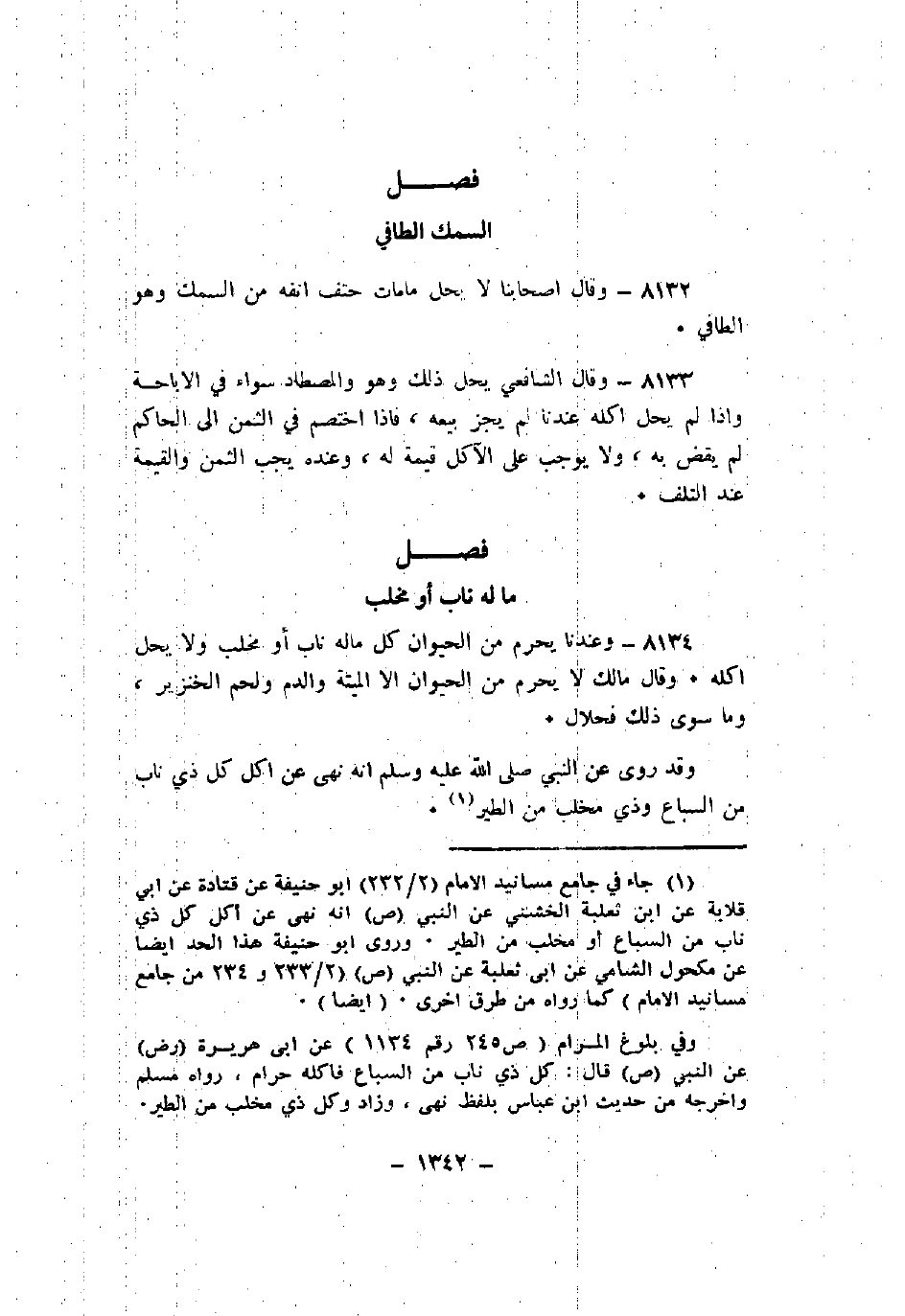 8134 - وعندنا يحرم من الحيوان كل ماله تاب أو مخلب ولا يحل أكله. وقال مالك لا يحرم من الحيوان إلا الميتة والدم ولحم الخنزير، وما سوى ذلك فحلال.