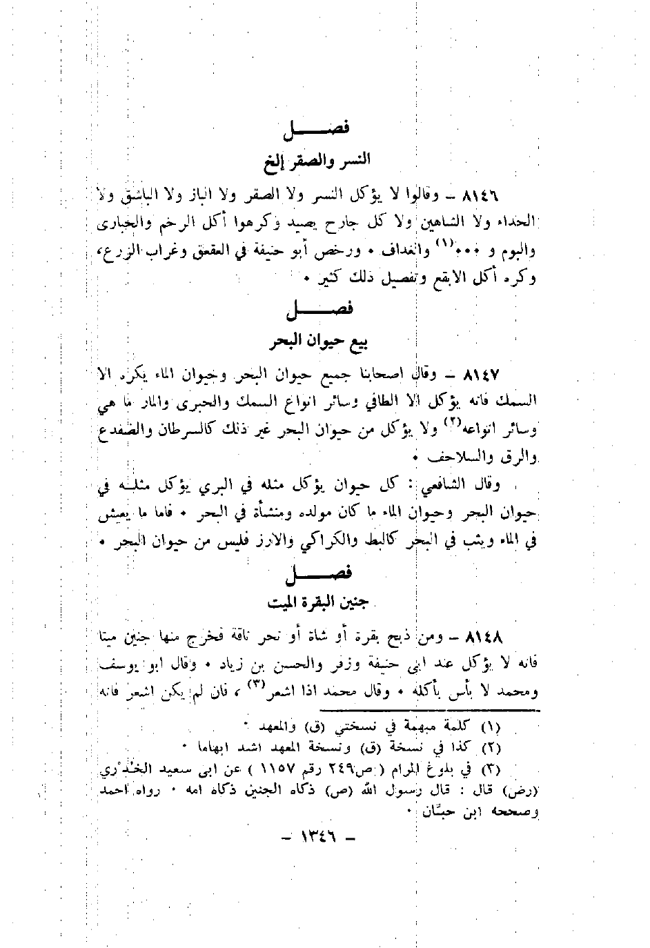 8148 - ومن ذبح بقرة أو شاة أو تحر ناقة فخرج منها جنين ميتا فإنه لا يؤكل عند أبي حنيفة وزفر والحسن بن زياد. وقال أبو يوسف ومحمد لا بأس بأكله. وقال محمد إذا أشعر، فإن لم يكن أشعر فإنه