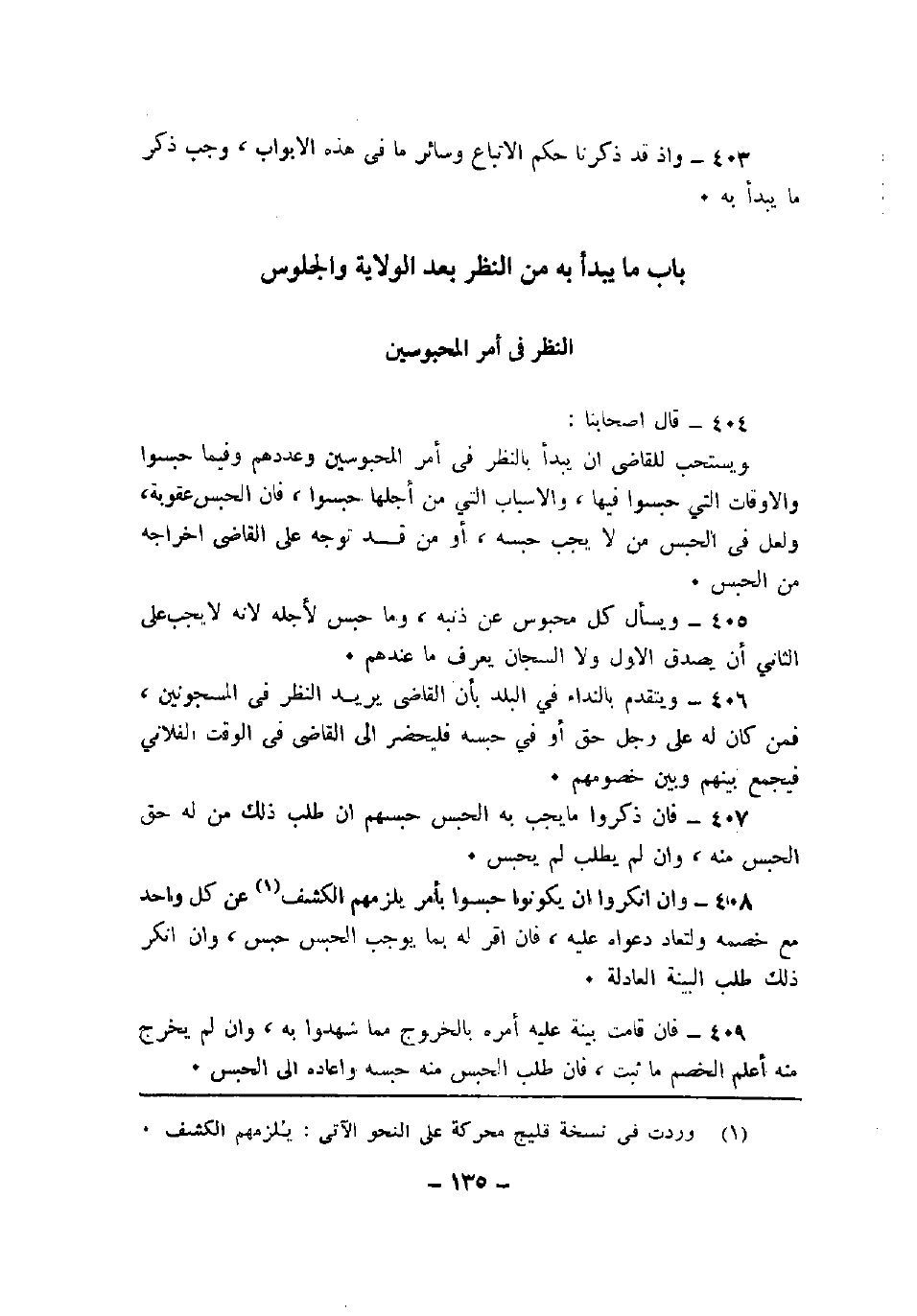 408 - وأن أنكروا أن يكونوا حبسوا بأمر يلزمهم الكشف عن كل واحد مع خصمه، ولتعاد دعواه عليه، فإن أقر له بما يوجب الحبس حبس، وأن أنكر ذلك طلب البينة العادلة.